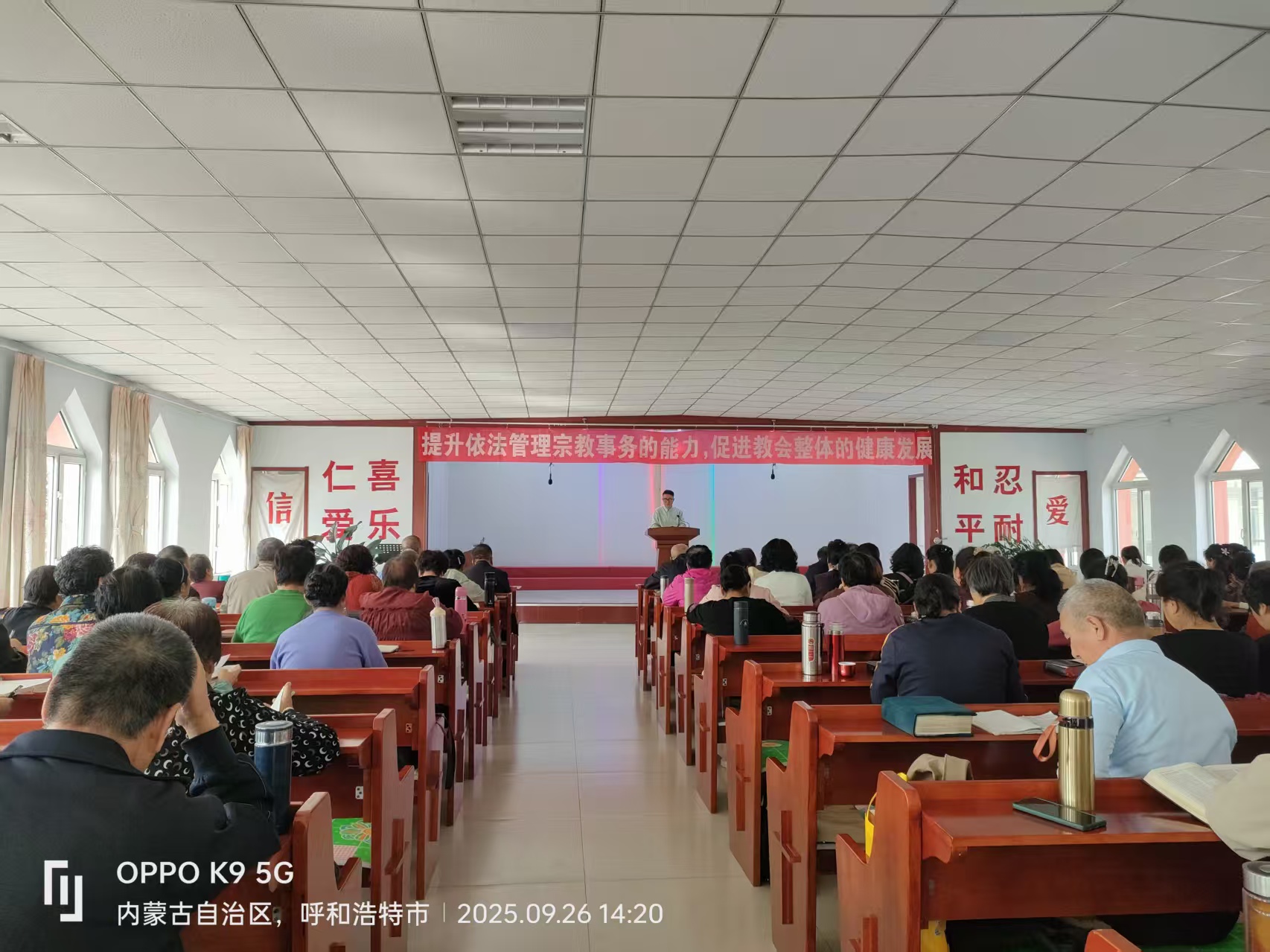 2025年9月25-27日,赛罕区基督教三自爱国运动委员会举办了为期3天的“提升依法管理宗教事务能力,促进教会整体健康发展”培训班,这是今年赛罕区基督教三自爱国运动委员会换届以来举办的第三次培训。本届班子成员、全体委员、监事会成员、固定处所和以堂带点负责人、教职人员及义工传道共200余人参加了学习。