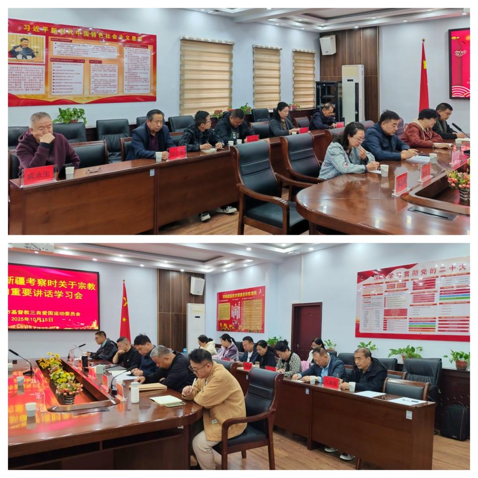 2025年10月15日,呼和浩特市基督教三自爱国运动委员会召开四届七次主席会务(扩大)会议。本届主席会务会议成员出席,监事会成员、常委、旗(县、区)团体及中心教堂负责人近三十人列席会议。会议由市基督教三自爱国运动委员会副主席、秘书长王海涛牧师主持,副主席刘旭牧师分别领学了习近平总书记在新疆考察时的重要指示以及在中央政治局第二十二次集体学习会上的重要讲话精神,副主席朱俊伟牧师就前一阶段呼和浩特地区圣职按立申报情况进行通报,并提出相关工作建议。